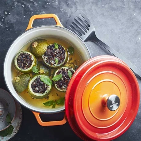 A l’intérieur de la cuve en fonte émaillée, la chaleur se diffuse uniformément. Le couvercle à picots permet d’humidifier vos préparations en continu pendant la cuisson car la vapeur d’eau créée se transforme en gouttelettes qui ruissellent à son contact.