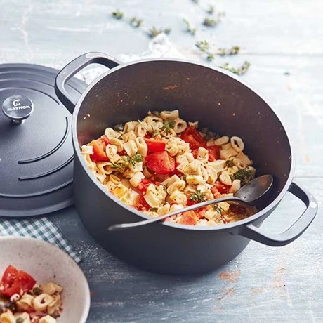 Alliant les bénéfices de la cuisson lente des cocottes traditionnelles à la légèreté de l’aluminium, la cocotte légère en fonte d’aluminium ronde 24 cm noire Mathon de 4,5 L est parfaite pour régaler vos proches.