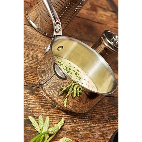 La Casserole Milady 16 cm fait partie de la gamme de poêles et casseroles DeBuyer Milady qui hérite du savoir faire de l’un des derniers fabricants français d’ustensiles de cuisine de qualité. La gamme Milady associe la robustesse d’une gamme professionnelle complémentée d’une finition polie brillante et d’un manche en fonte d’inox ergonomique. En inox, la casserole possède un fond sandwich.