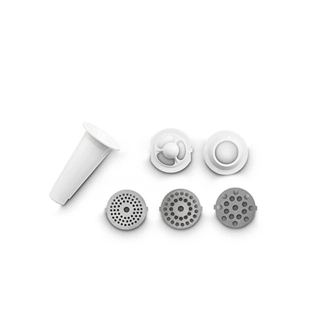 Tout équipé, le hachoir dispose de 3 grilles en inox d’un diamètre de 50 mm de différents maillages ; une grille fine (3 mm) pour hachis parmentier, steaks, pains de viande, keftas…, une grille moyenne (4,5 mm) pour hachis à bolognaise, lasagnes, moussaka, cannelloni de légumes…et une grille épaisse (7 mm) pour tartares, terrines de poisson, salami, pâtés de campagne… Le hachoir est également livré avec un kit à saucisses pour merguez, chipolatas, saucisses de poisson…et un kit à kebbés pour les spécialités orientales.
