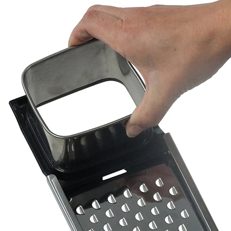 La mandoline est en inox 18/10 et le réservoir à pâte qui coulisse sur la râpe est amovible pour un entretien facilité.